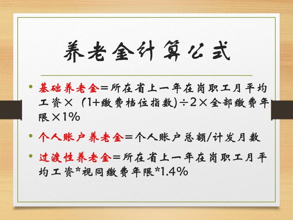 1)月基础养老金=(全省上年度所有职工的月平均工资+本人指数化月平均缴费工资)÷2×缴费年限×1%